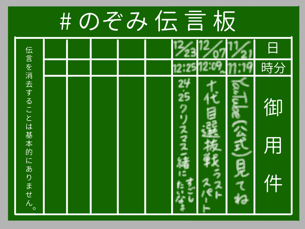 お知らせ : #のぞみ伝言板 をXのプロフィールに記載してくれたら、ファンコミュニティに招待できます、、!