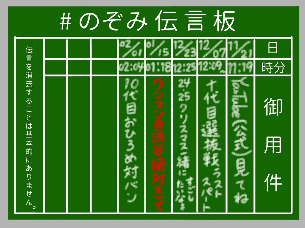 お知らせ : #のぞみ伝言板 をXのプロフィールに記載してくれたら、ファンコミュニティに招待できます、、!かかかぶぶぶききき!!!公式にコミュニティ参加希望の旨をDMお願いします!そしてX(@NOZOMI_kakaka)のフォローもよろしくねっっ